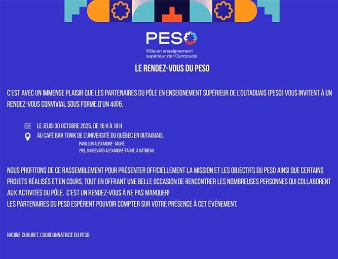 C’est avec un immense plaisir que les partenaires du Pôle en enseignement supérieur de l’Outaouais (PESO) vous invitent à un rendez-vous convivial sous forme de 4 à 6.